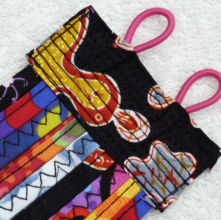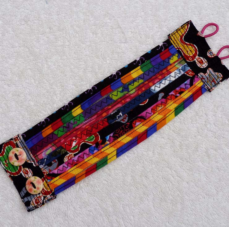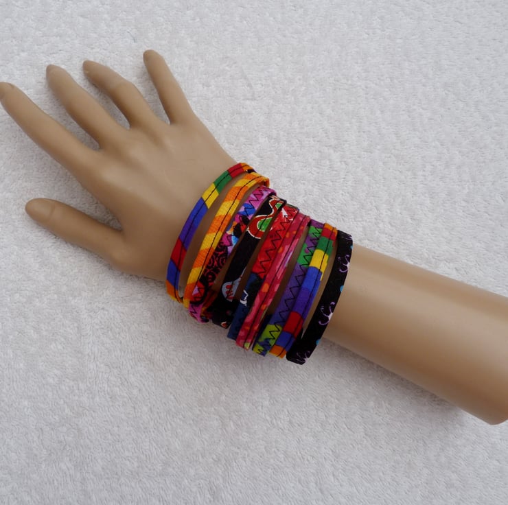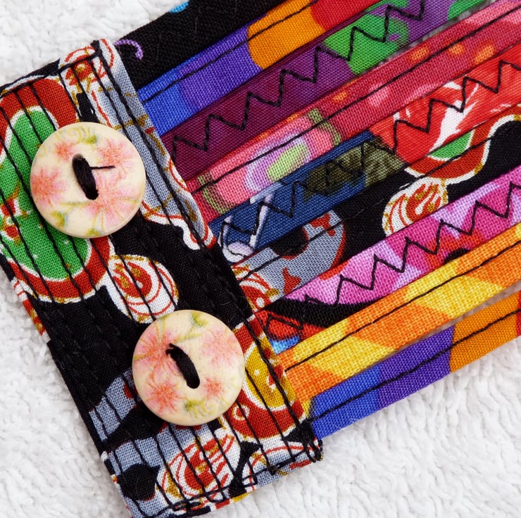 These wonderful fabric bracelets are made from 100% cotton fabric. The material has been decoratively stitched into narrow strips, and these are then stitched into a cuff, with elastic and two buttons for a closure.
