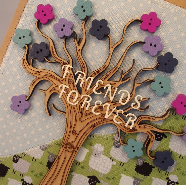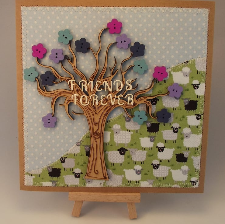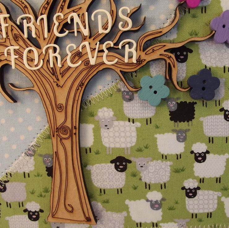 I have made the background of the card from fabric. The tree and buttons are wooden and there is handmade wording in the tree. Don't you just love the sheep!