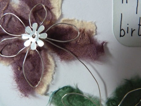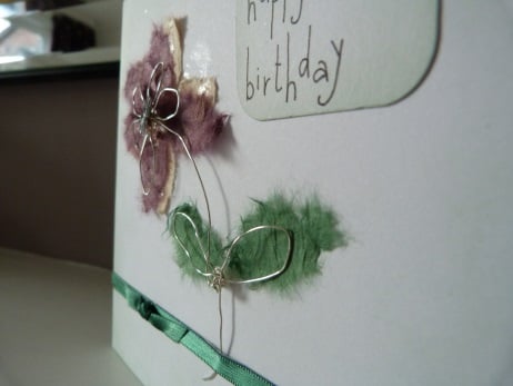 A completely hand made and uniquely designed card. Consisting of quality pristine white card which has been shaded in green ink and decorated with a pretty daisy flower. This has been made the shape hand crafted from silver wire. The leaves and petals have been hand shaped from purple, cream and green mulberry paper. Finished off with happy birthday tag with silver sequin flower. Finished off with emerald green ribbon and bow.