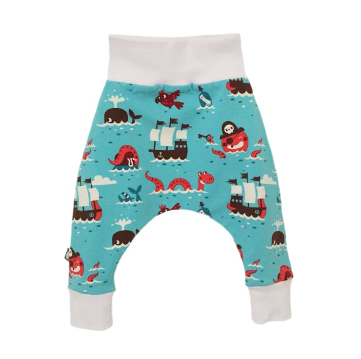 Super Cute and easy to wear Modern Harem Pants - let your little one wriggle away in these super soft Baby Harem Pants in super cute & soft bright blue PIRATE print fabric to give that perfect Modern Edge to your babies outfit.
