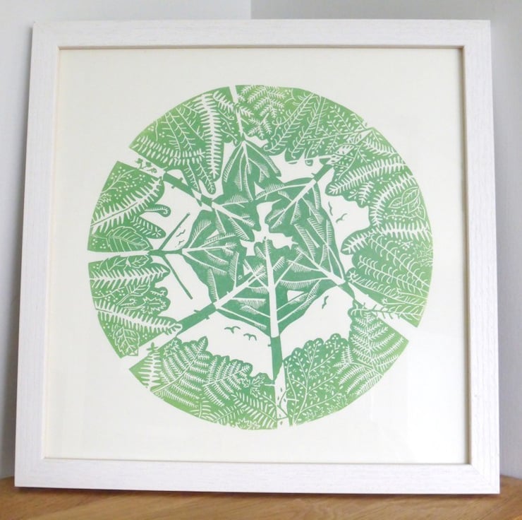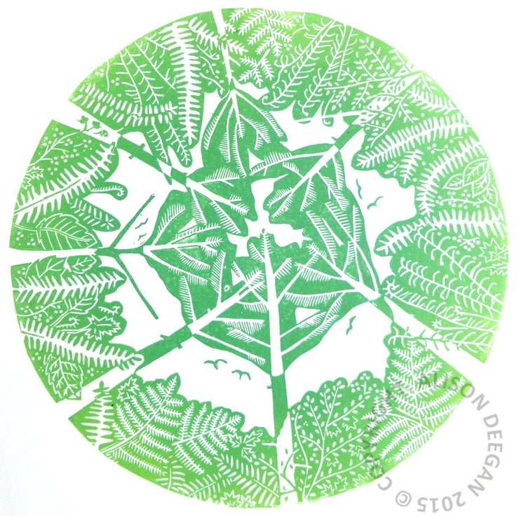 This is an original lino cut print (limited edition of 20 in this colour). Printed from a hand-cut lino plate in GREEN oil-based but water washable inks onto good quality Zerkal printing paper. The printed area is approximately 24X24cm and there is a white border for matting/mounting and framing. These items are hand-printed and so vary slightly depending on ink density, character of the paper, pressure of the press and the way the wind blows (ok, maybe not the last bit).