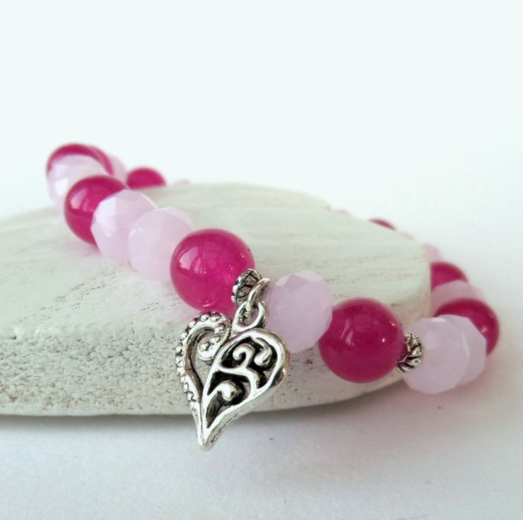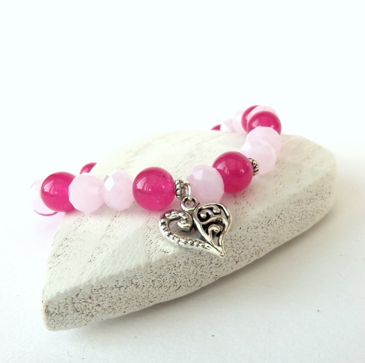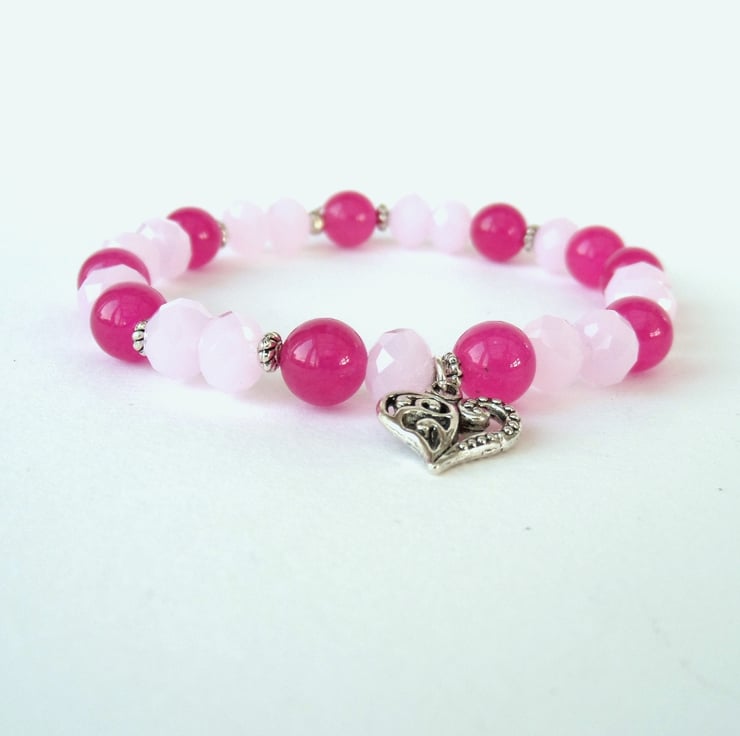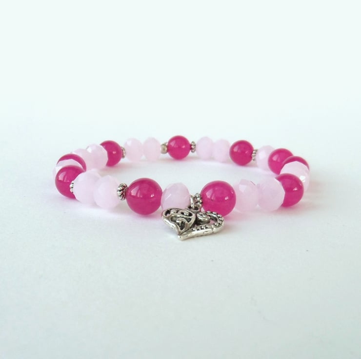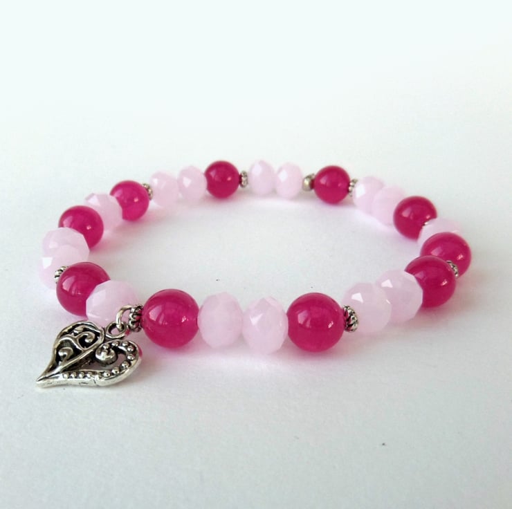 A lovely combination of pale pink crystals and rose pink jade gemstones look great with a heart charm in this stretchy handmade bracelet.