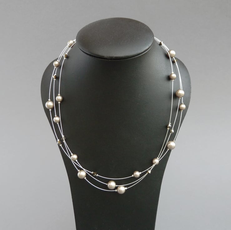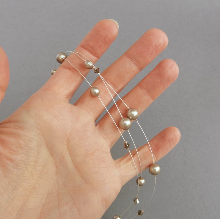 This taupe, floating pearl necklace has been created using platinum glass pearls and metallic crystals. This coffee multi-strand necklace would make an elegant accessory for a bridesmaid in a neutral themed wedding.