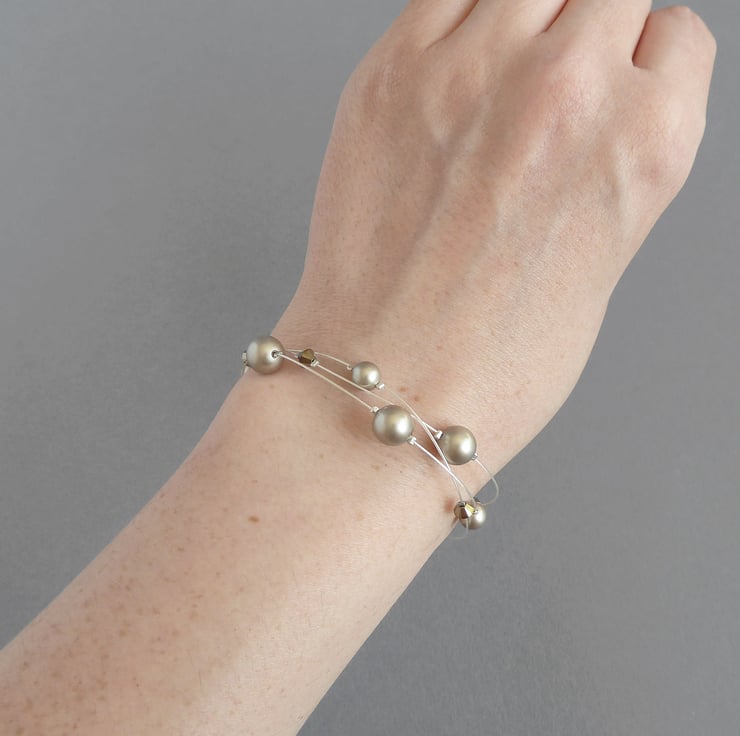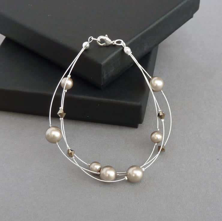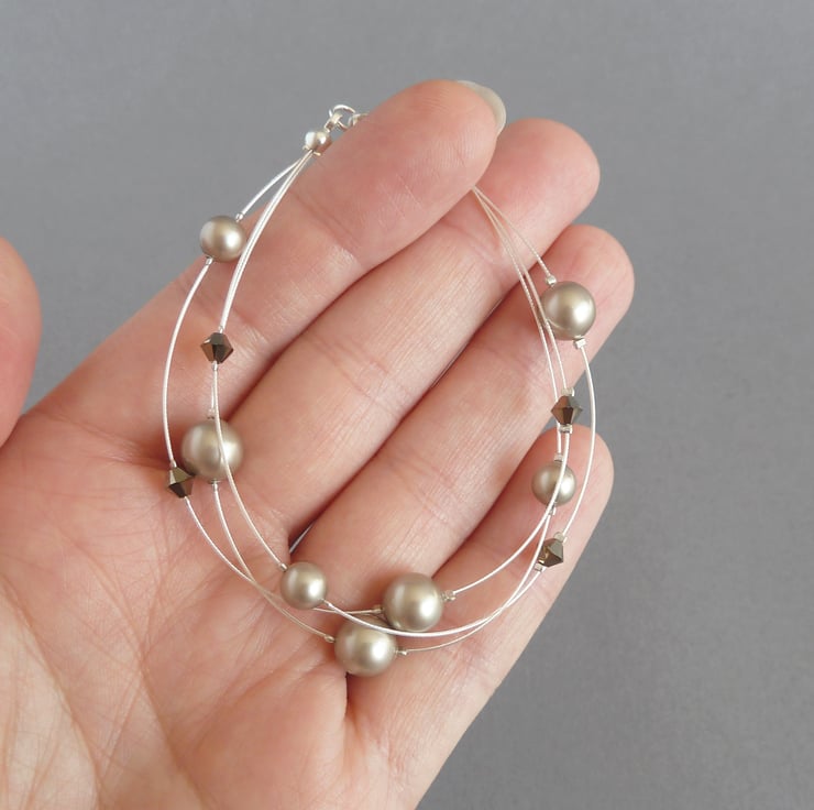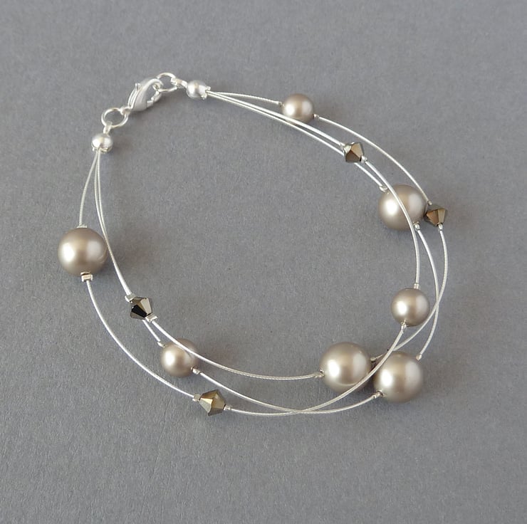 This taupe, floating pearl bracelet has been created using platinum glass pearls and metallic crystals. This multi-strand bracelet's muted colour makes it an ideal gift for a bridesmaid in a wedding with a champagne colour scheme.