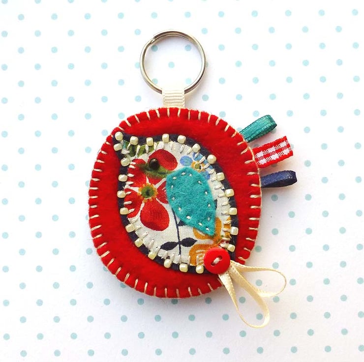 It featured a little bird design in lovely floral Liberty of London fabric. It has been edged with cream seed beads and appliqued onto a bright red felt base. The bird is finished with a stitched turquoise felt wing and button and ribbon tail detail. The base has been finished with cream blanket stitch edging and coordinating ribbon details. There is a split ring keyring attached at the top with cream ribbon.