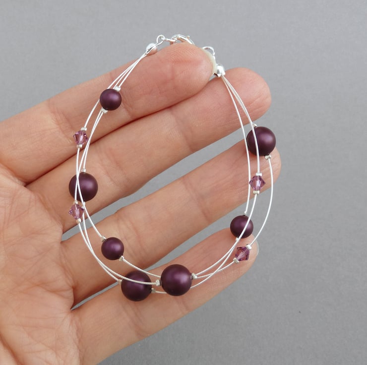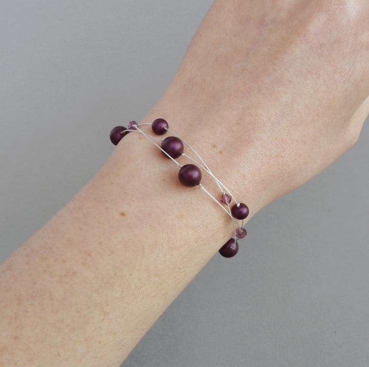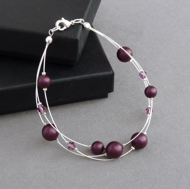 This plum bracelet has been created using elderberry Swarovski pearls and Swarovski crystals. Its purple colour would make this multi-strand bracelet an elegant accessory for a bridesmaid in an aubergine wedding.
