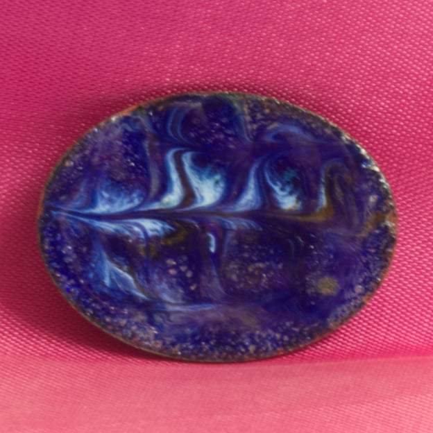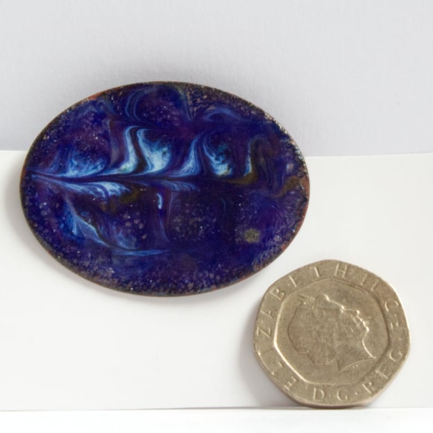 A pattern of white scrolled on a blue background decorates this brooch. The blue is laid over layers of clear enamel and the copper base shines through in tones of golden-brown