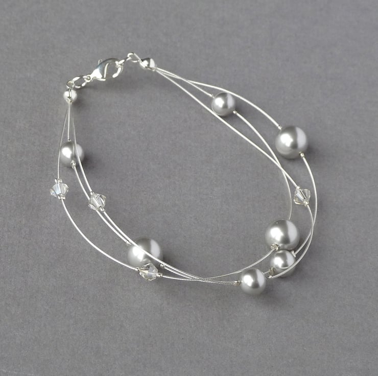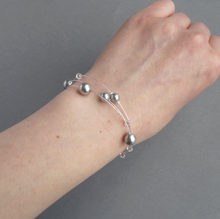 This silver grey, floating pearl bracelet has been created using glass pearls and shimmering crystals. The multi-strand bracelet's timeless style makes it an ideal gift for a bridesmaid in a light grey wedding.