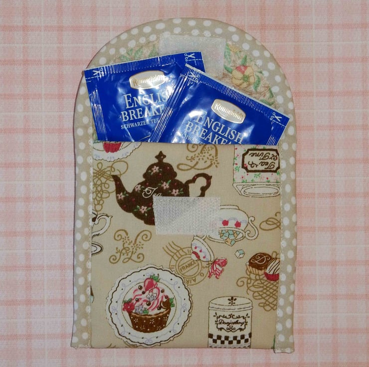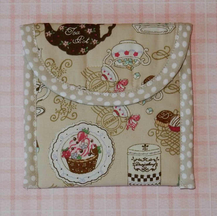 This mini wallet measures approximately 4.5 x4.5 inches (when closed).It is made from pretty fabric featuring cups, tea pot and sugar basins etc., and trimmed with spotty bias binding. It has a toning lining and fastens with Velcro. It also has a layer of cotton wadding. It would make a great wallet for your special teabags or pop in some plasters or painkillers for an emergency, to keep in your handbag.