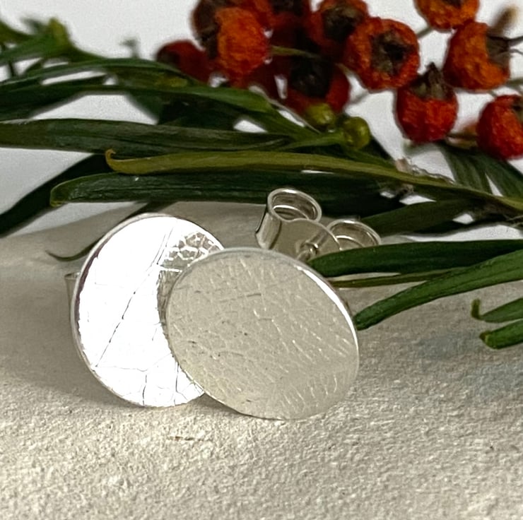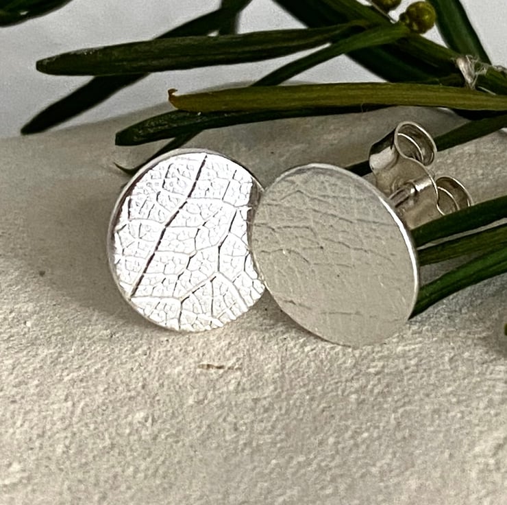 Small Silver Stud Earrings - Handmade in UK imprinted with a leaf pattern