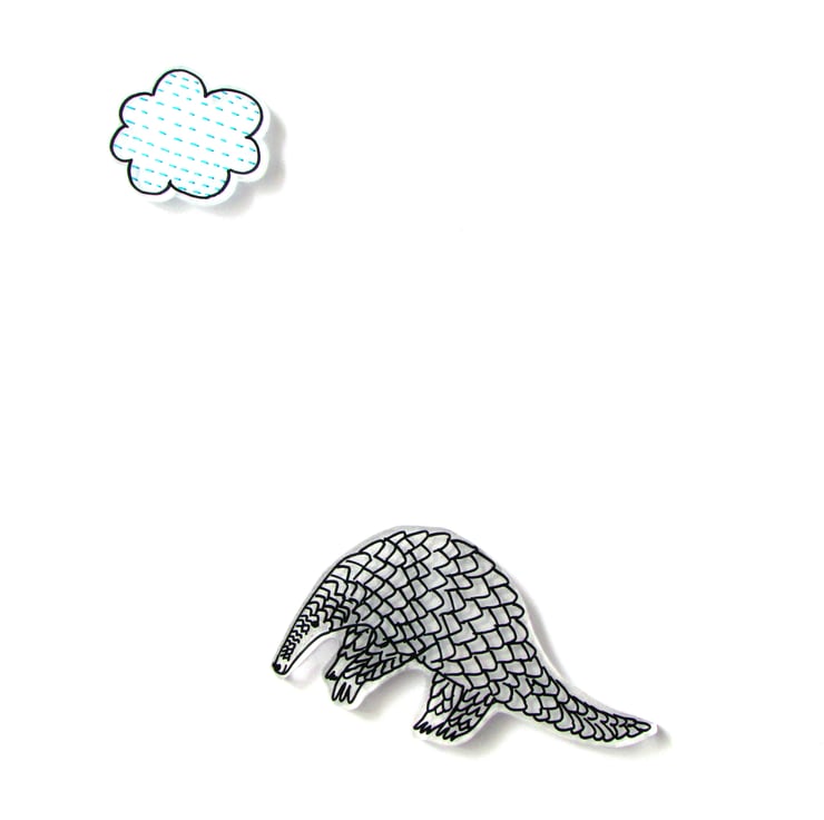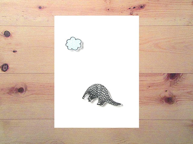 A hand drawn shrink plastic pangolin on an A6 white card with envelope.