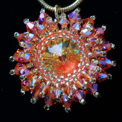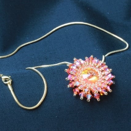 This little pendant is not much more than an inch in diameter. So it is ideal for anyone who doesn’t like big pieces of jewellery. Nevertheless the colours are bold and bright and it is full of sparkle; ideal to wear on a hot day with a pretty summer dress or for an evening party under the lights. No less than 35 tiny orange Swarovski bicone crystals are stitched around a matching pretty Swarovski rivoli. Each crystal has an AB coating, meaning that one side of each bicone has been covered with a thin metallic coating. This gives the crystals a lovely iridescent shimmer. The crystals are stitched in two layers for a starburst effect. The rivoli makes a striking centerpiece as its pointed shape, front and back, gives it depths in which the gold of the tiny surround of seed beads is reflected. The piece is strung on a gold plated snake chain. This could be exchanged for a longer chain at a small extra cost if required although, depending on the length you require, this could delay me sending you the piece for a few days. The colour of the crystals is known as Sun.