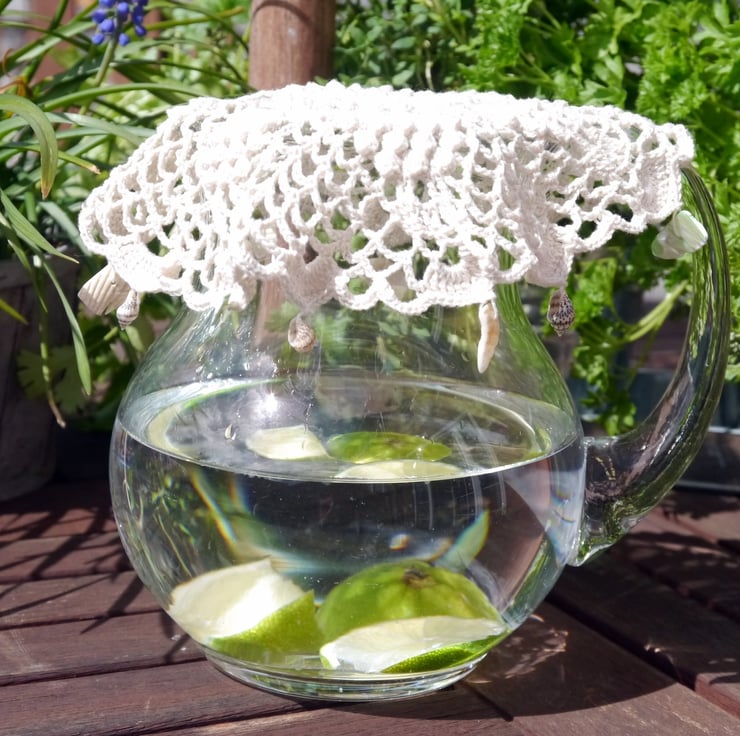 Get ready for outside dining this summer. This useful bowl or jug cover is perfect for keeping insects out of your drinks and food. Crocheted with good quality cream cotton and decorated with shells to stop it blowing away in the breeze. It has an intricate pineapple detail and can also be used as a coaster or doily.