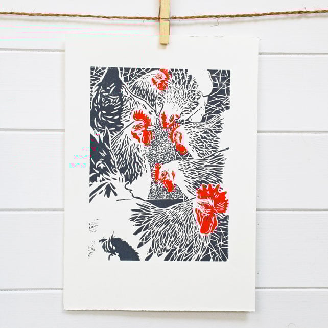 Linocut print of flock of white Sussex Hens titled 'The old man and his girls'. Original, hand cut linocut print, printed on hand press in dark grey and red ink. Signed and titled in pencil by the artist.