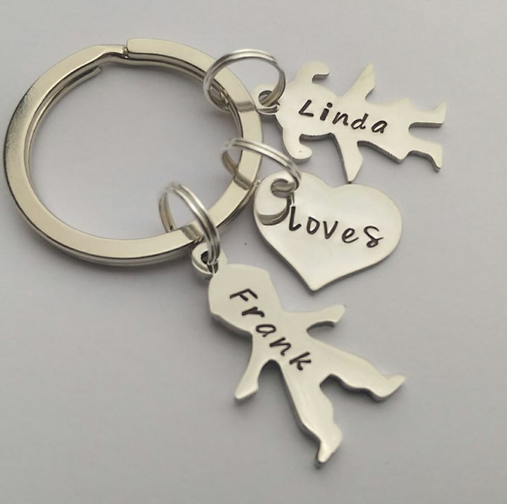 It then has a boy or a girl figure added to it which measures 2cm and can each be stamped with either a name or a date of your choice. The keyring includes one, if you would like to add more please contact me as I can add as many as you like for £6 each.