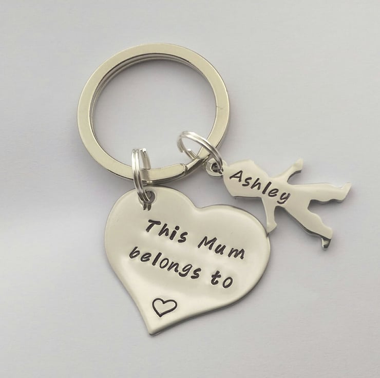 This is a keyring made from a stainless steel heart measuring 32x25mm. The example is shown as stamped with This Mum belongs to, but this wording can be changed to anything you like...some examples are Dad, Mummy, Grandma, Grandad, Nanny or Nana.