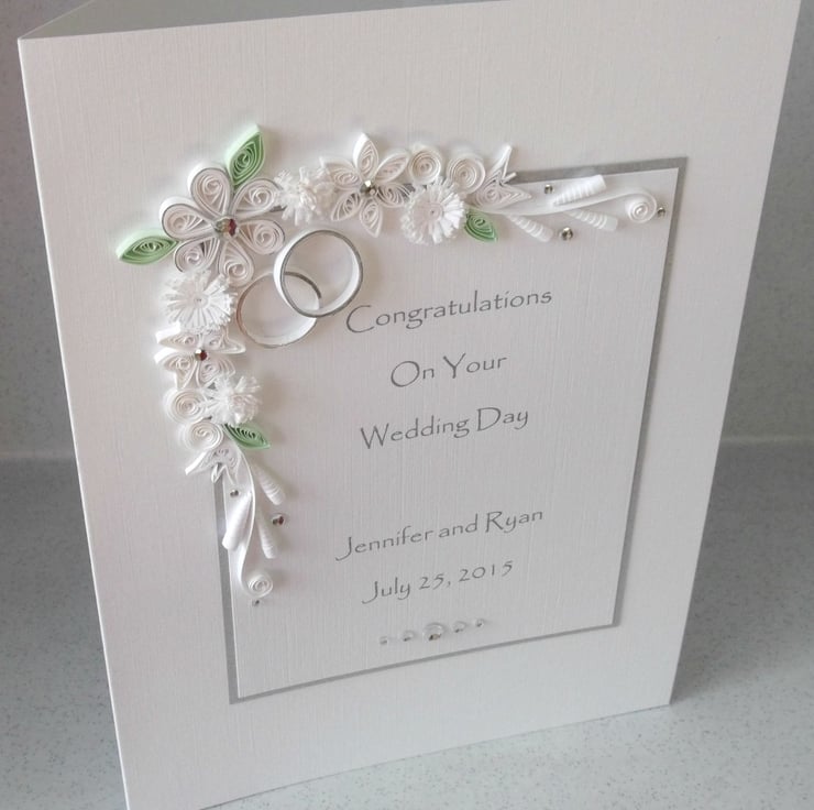 This quilled, handmade card is perfect for sending special congratulations to the special couple. The panel can be printed with names, date and/or any message of your choice. Say anything you'd like....just let me know in the “notes to seller” section at checkout or send me a message. Likewise if you would like a different colour choice or a similar card for a different occasion.