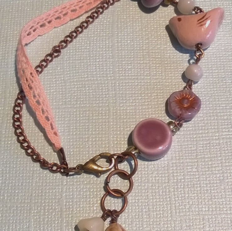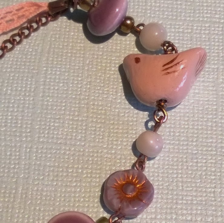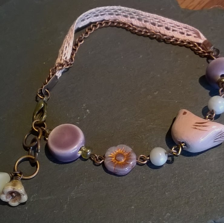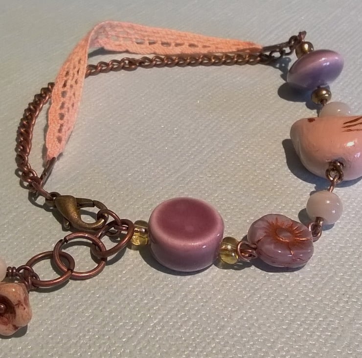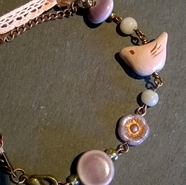 A vintage-inspired, feminine bracelet made with Czech glass and ceramic beads in shades of white and purple. Half of the bracelet consists of a peach lace ribbon and antique copper chain. The bracelet features a hand-made polymer clay bird, hand-painted and varnished.