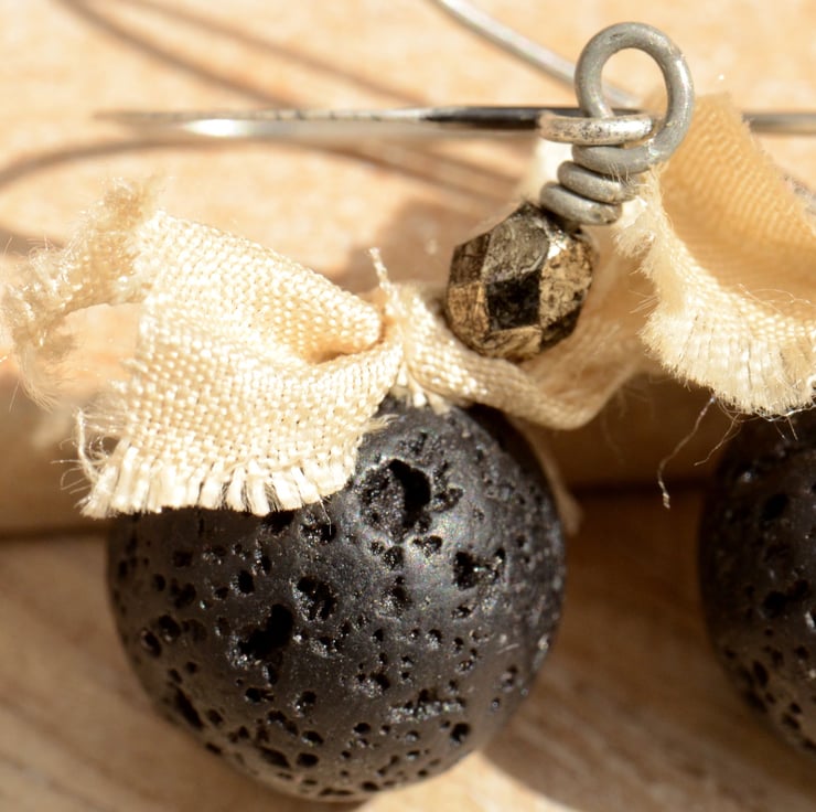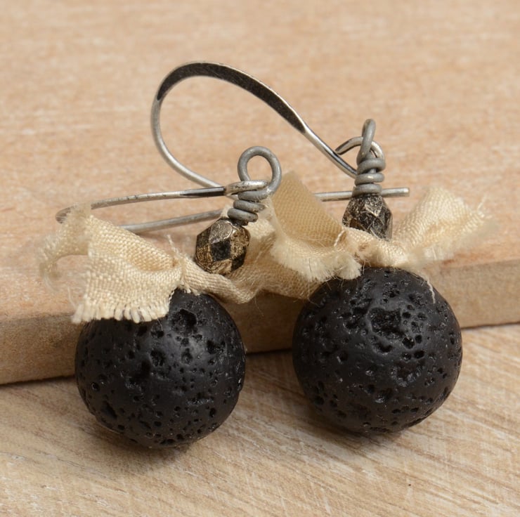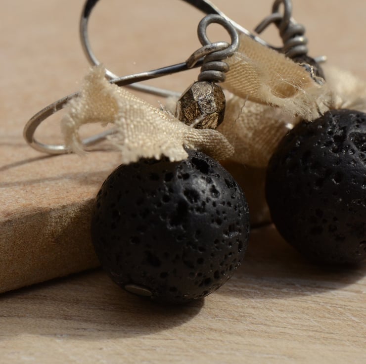 These handmade earrings feature gorgeous round black lava rock gemstone beads which I have teamed with little bows of cream sari silk ribbon and gunmetal Czech glass faceted beads, finished on antique silver grey earwires.