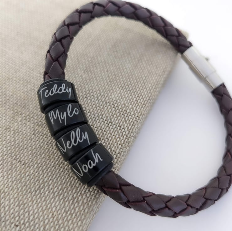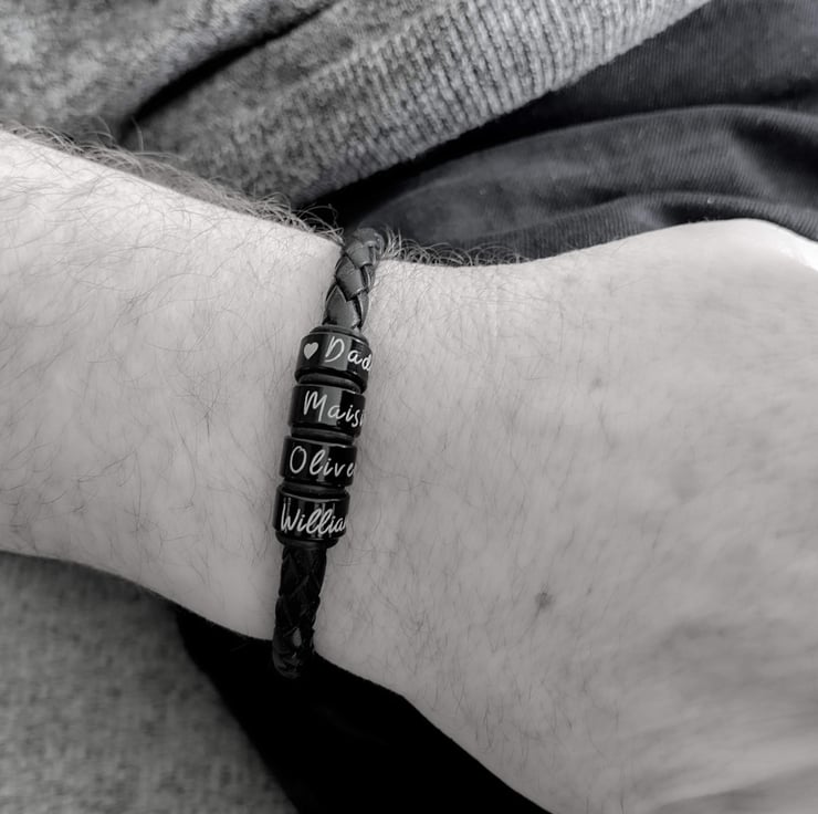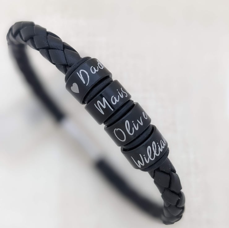 Woven leather bracelet (black or dark brown) with engraved black rings. Choose your own names, dates or other words.