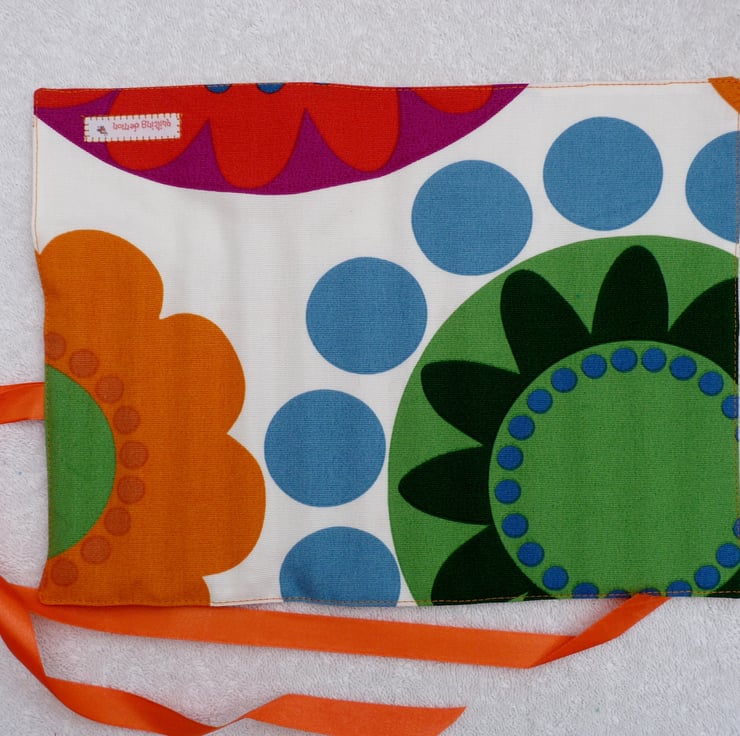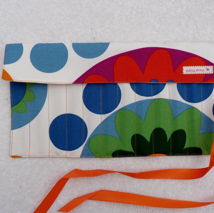I have used a 100% cotton fabric to create this fantastic crochet hook case. It is sewn from a lovely Ikea flower print fabric with a plain cream cotton lining and has an orange ribbon tie.