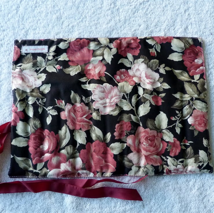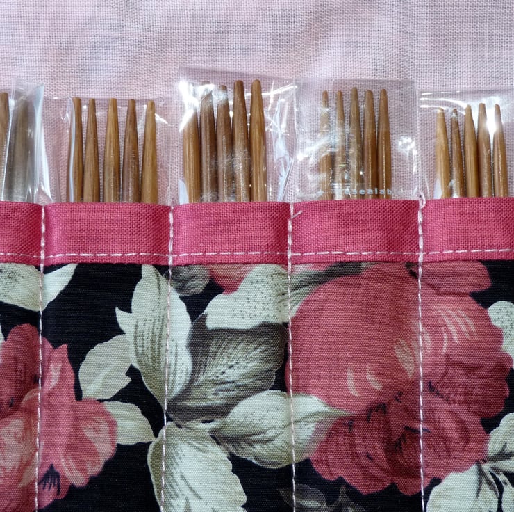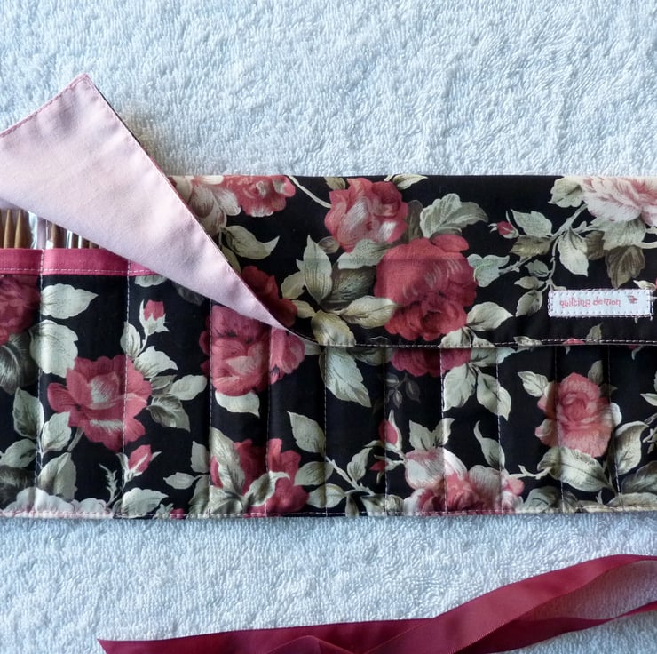 I have used a 100% cotton fabric to create this fantastic double pointed needle case. It is sewn from a beautiful print fabric with a pink cotton lining and has a burgundy ribbon tie.