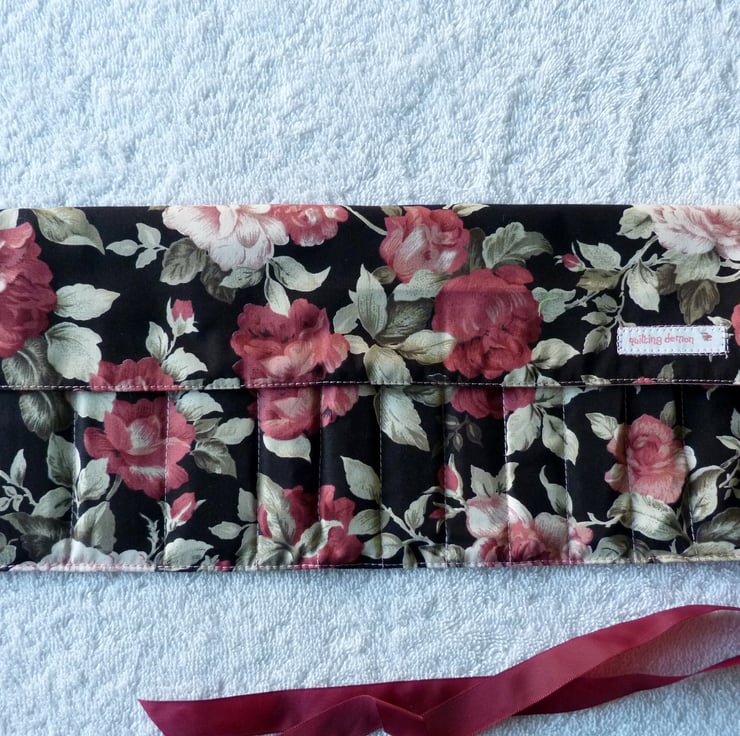 The top of the holder is a flap which folds over to keep the needles safe. Once rolled up, the ribbon secures the holder. It is top stitched to achieve a professional finish. Total size when placed out flat is 9" x12.5".