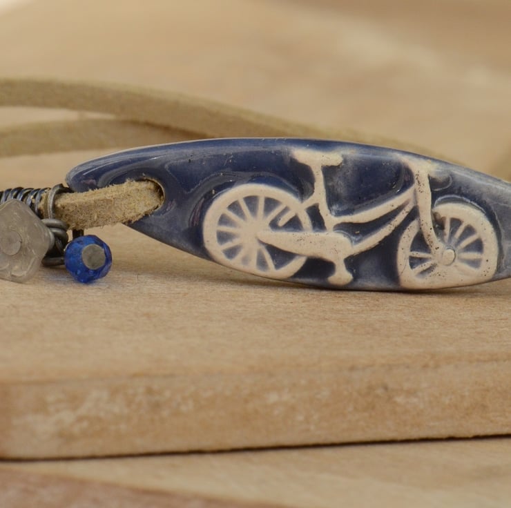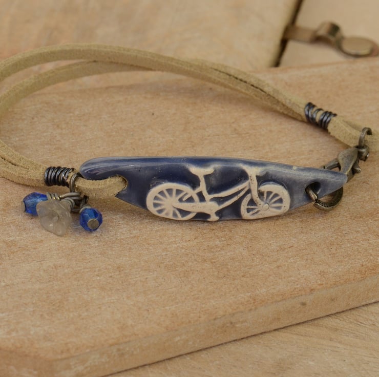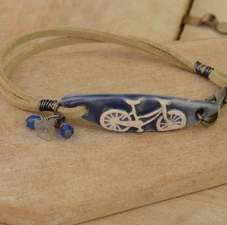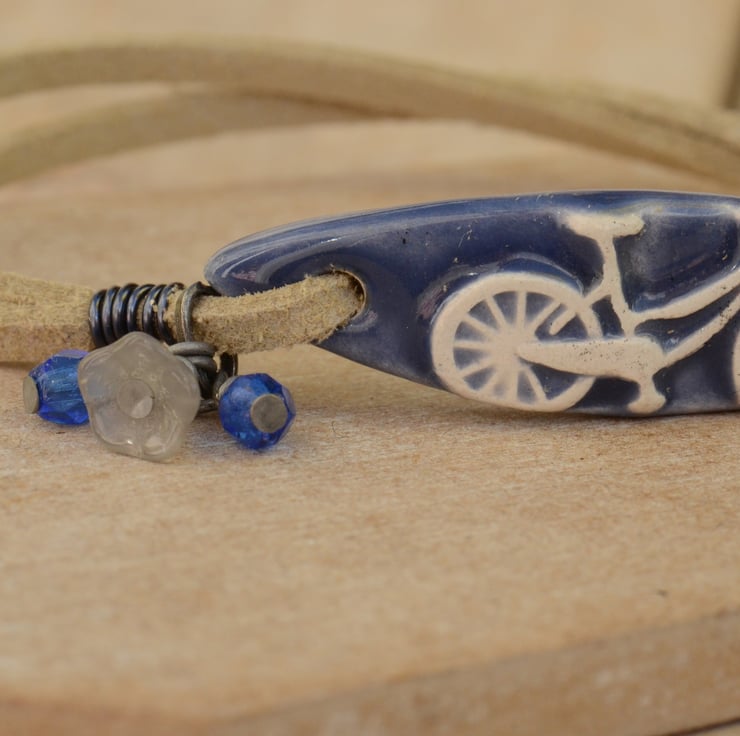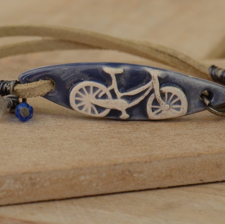 I have used a handmade ceramic denim blue bicycle bar as the focal for this bracelet which I have teamed with two strands of creamy faux suede finished with a trigger clasp and a bouquet of Czech flower cup and two faceted cobalt blue beads.