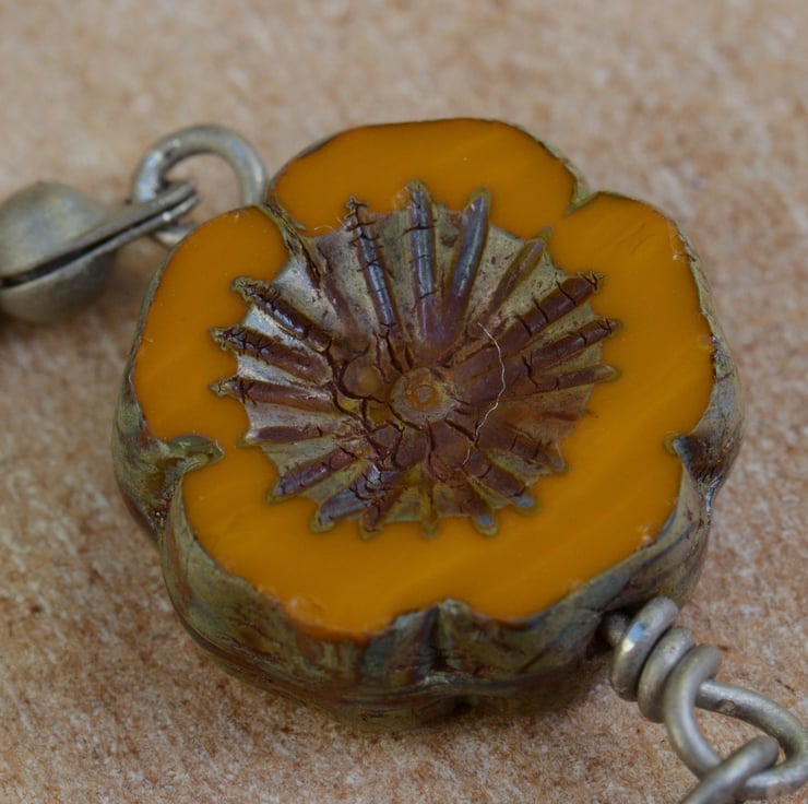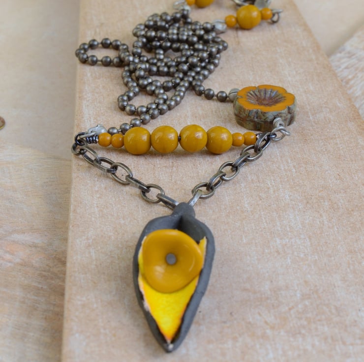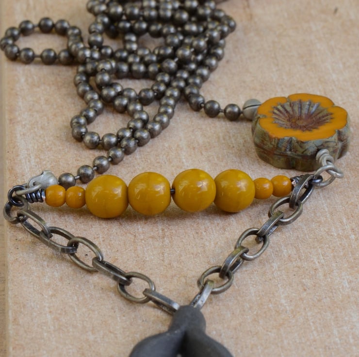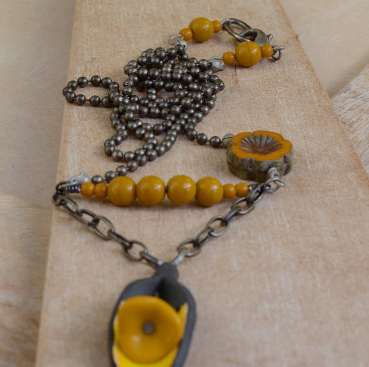 I have used a beautiful ceramic cala lily shaped flower pendant which is a vibrant yellow colour inside as the focal for this necklace which I have teamed with a little drop of mustard yellow Czech flower cup bead, a little bar of mustard opaque Czech glass beads, a Czech Picasso finish flower blossom bead, finished with antique silver grey ball chain and trigger clasp, there are also little trios of mustard glass beads before the clasp.