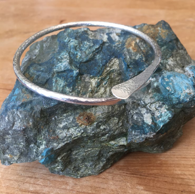 A beautifully crafted hallmarked bangle in 3mm 925 100% recycled silver, hammered finish causing light to reflect on the many surfaces as the sun does on the sea.