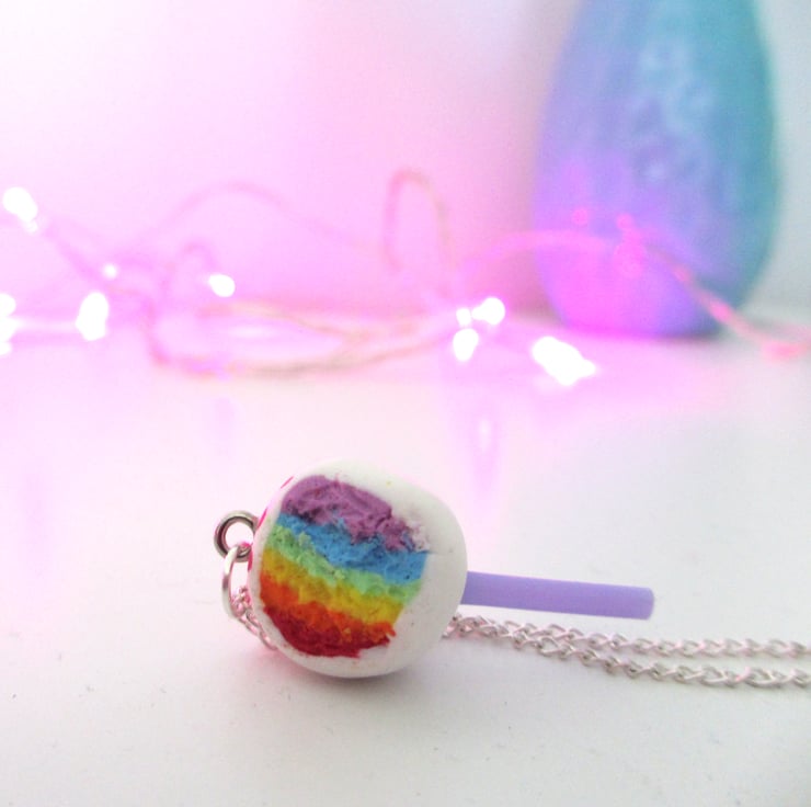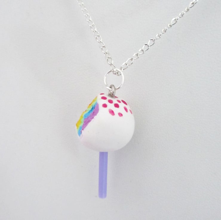 A bright white iced cake pop charm, on a coloured stick, with painted pink sprinkles on top. The charm is complete with a "bite" out of the side/top to show the rainbow of coloured cake inside!!