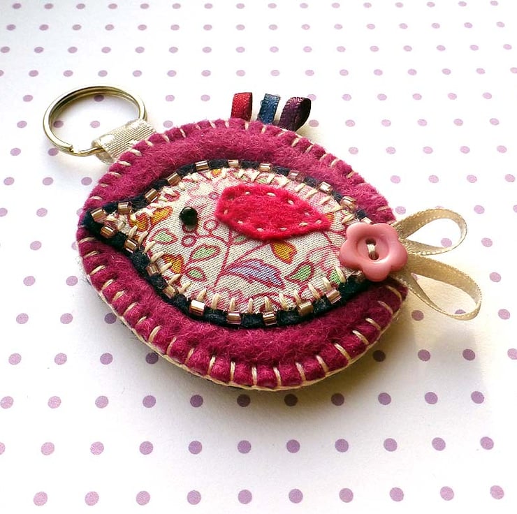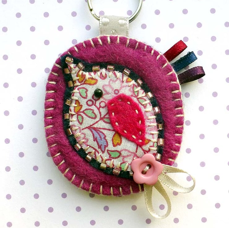 It features a little bird design in lovely floral print fabric. It has been edged with coordinating pink seed beads and appliqued onto a mulberry pink felt base. The bird is finished with a stitched fuchsia felt wing and button and ribbon tail detail. The base has been finished with cream blanket stitch edging and coordinating ribbon details. There is a split ring keyring attached at the top with grey dotty ribbon.