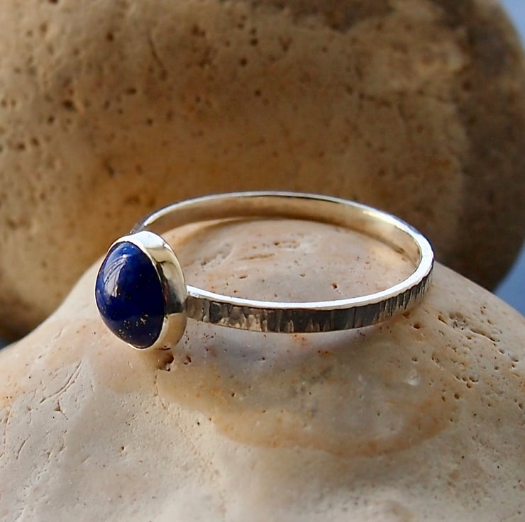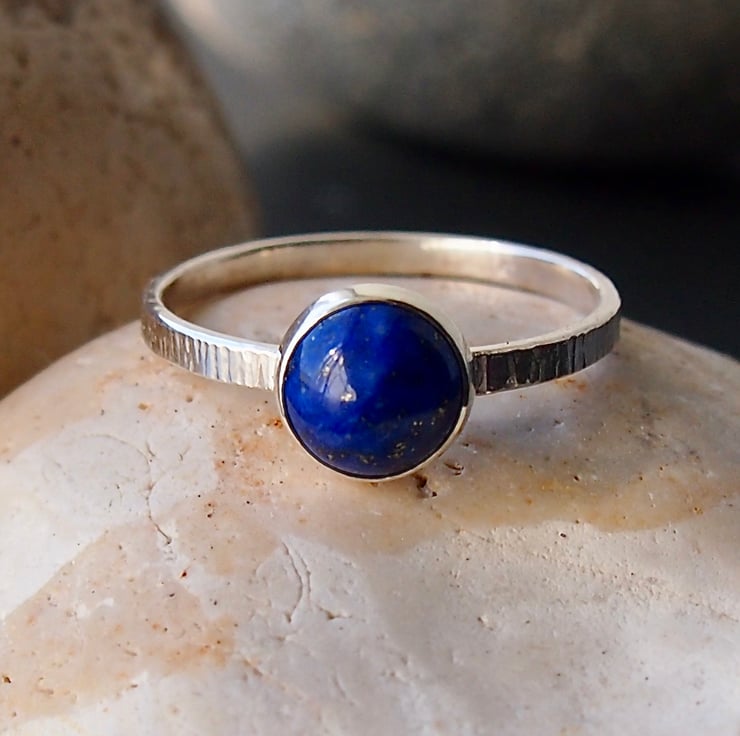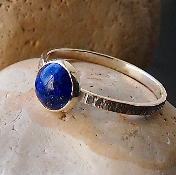 An 8mm lapis lazuli cabochon is set onto a 2mm textured band. This is a lovely deep lapis blue colour. Stamped with our makers mark registered at the Edinburgh assay office.