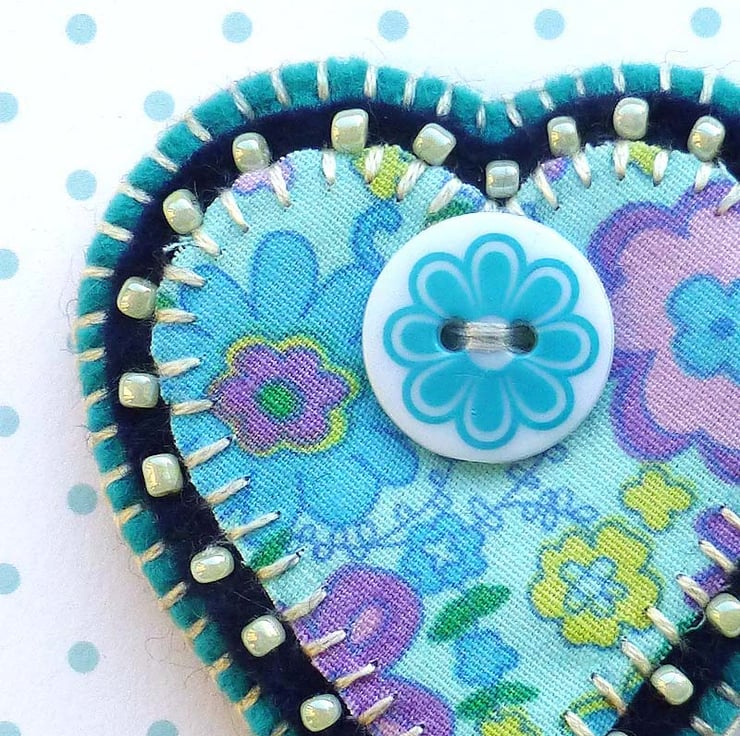 It features an appliqued heart design in lovely retro floral print fabric. It is mounted onto a navy blue felt base and edged with pretty cream seed beads. The heart is further mounted onto turquoise felt and is finished with a flower print button and ribbon details in coordinating colours. It has a brooch backing for easy attachment.