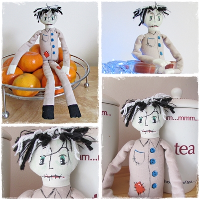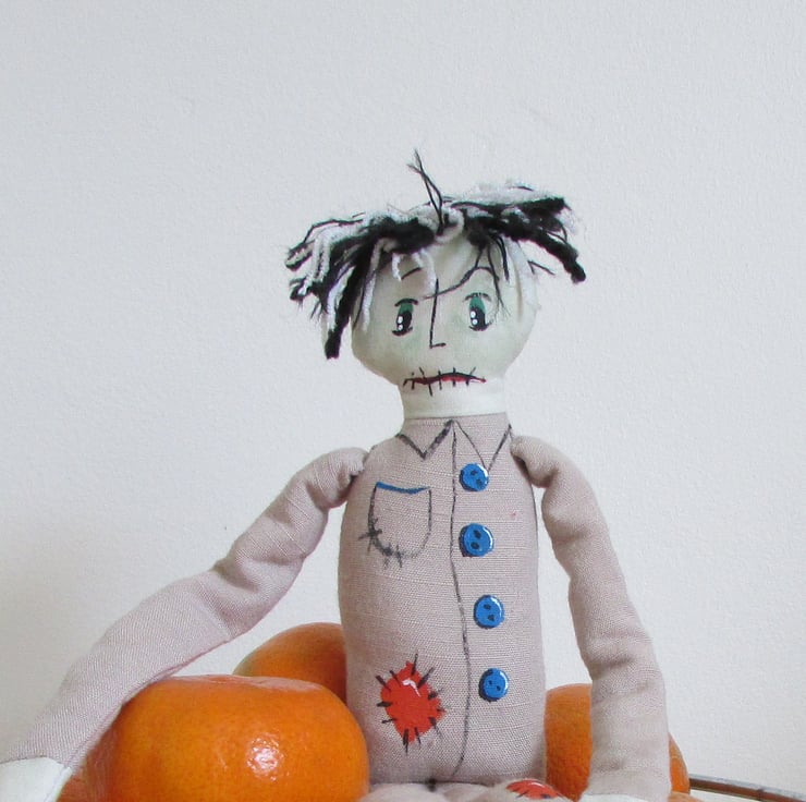 He has a green tint to his face, sad eyes and a stitched up painted mouth. His buttons and patches are also painted onto the cotton. His black and white hair is made from wool.