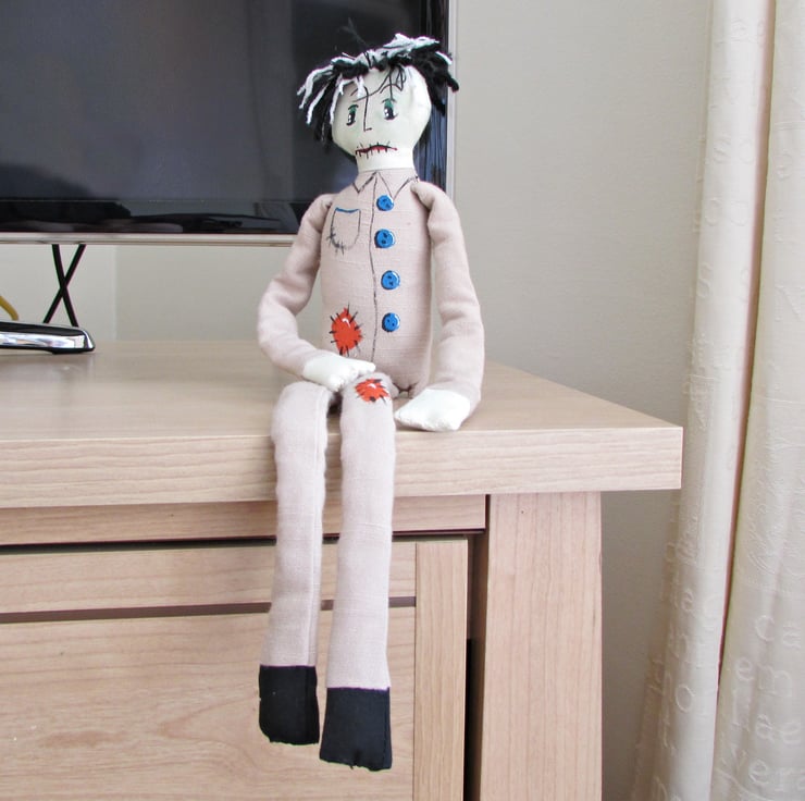 Sad Zombie Art Doll, this primitive art doll has been handmade from cotton, the face and clothes details have been hand painted.