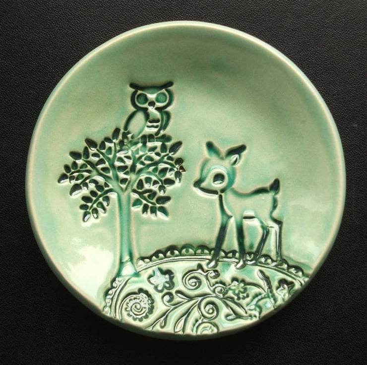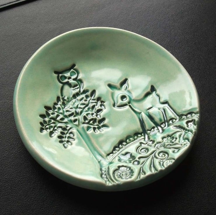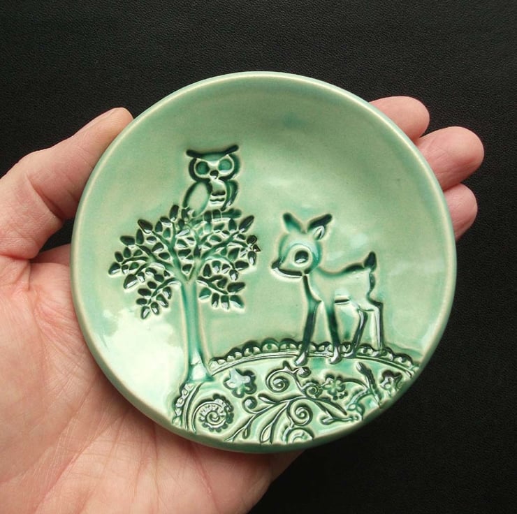 This teeny, little woodland themed dish, is glazed in a blue glaze.