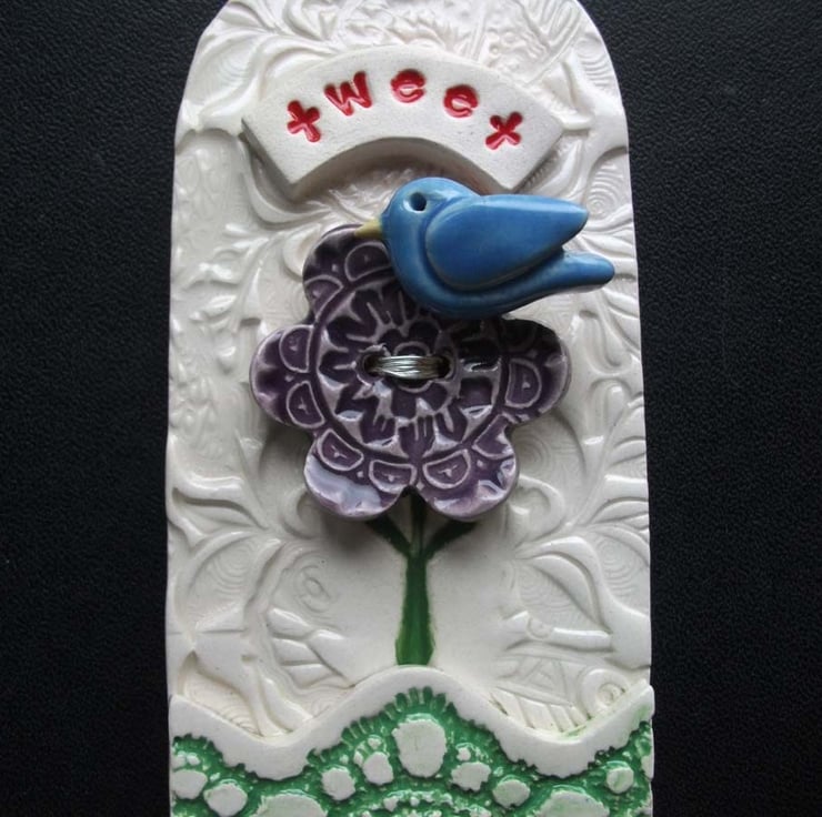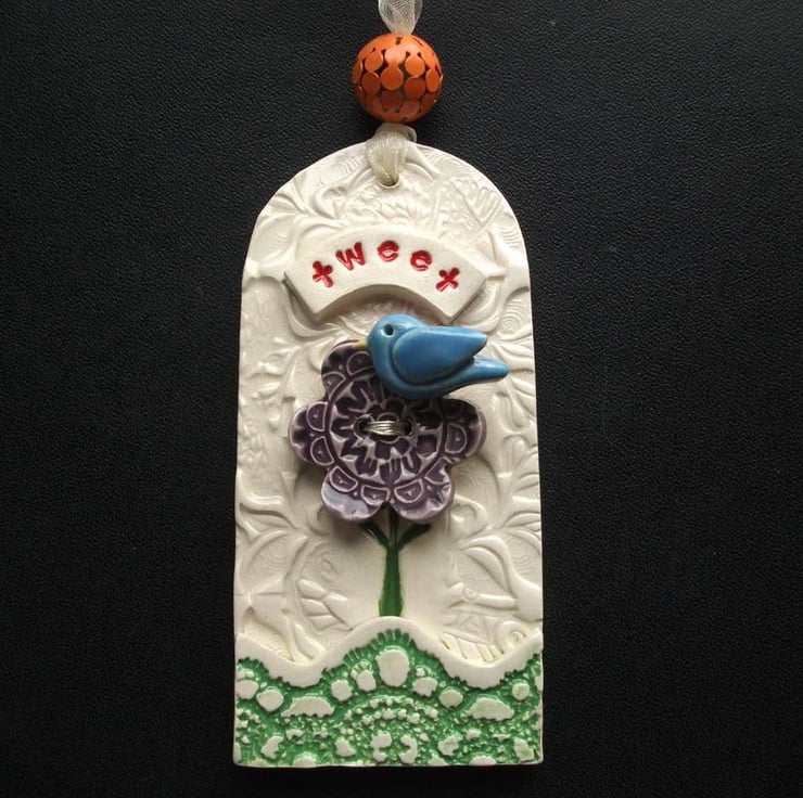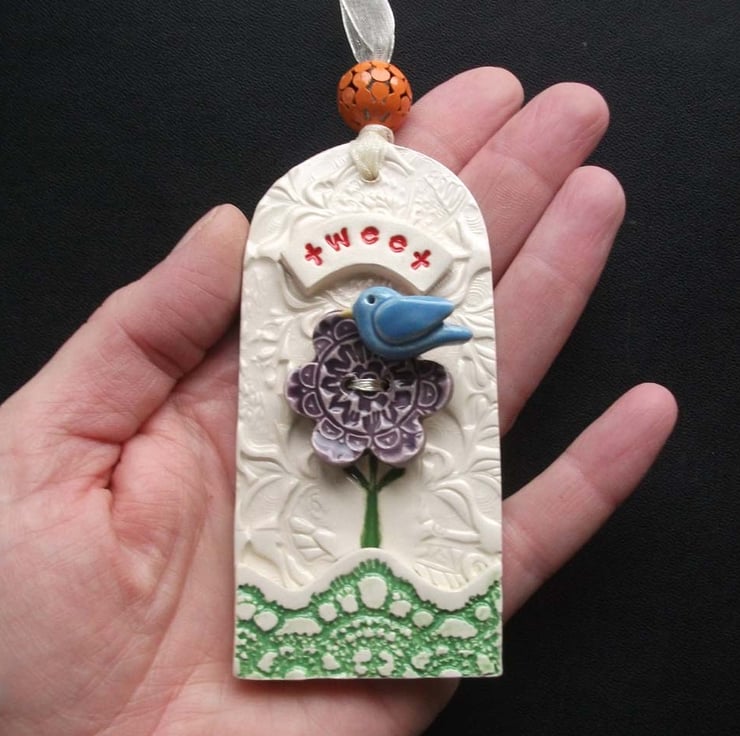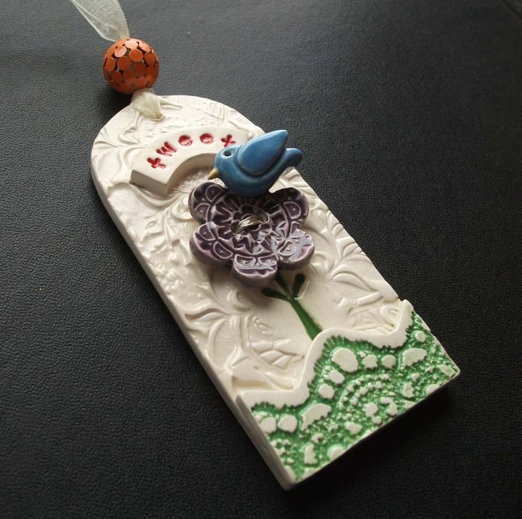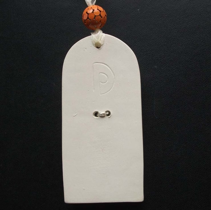This tag style hanging decoration is made from white earthenware clay.