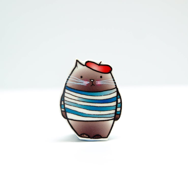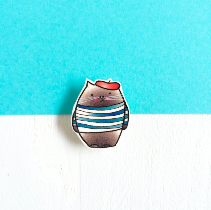 Monsieur le Chat is an original illustrations from my sketch book printed to shrink plastic, each piece is hand cut and baked before being varnished and mounted on a badge pin.