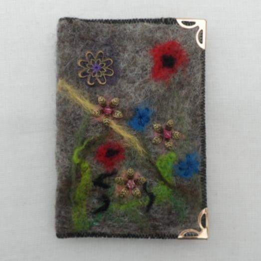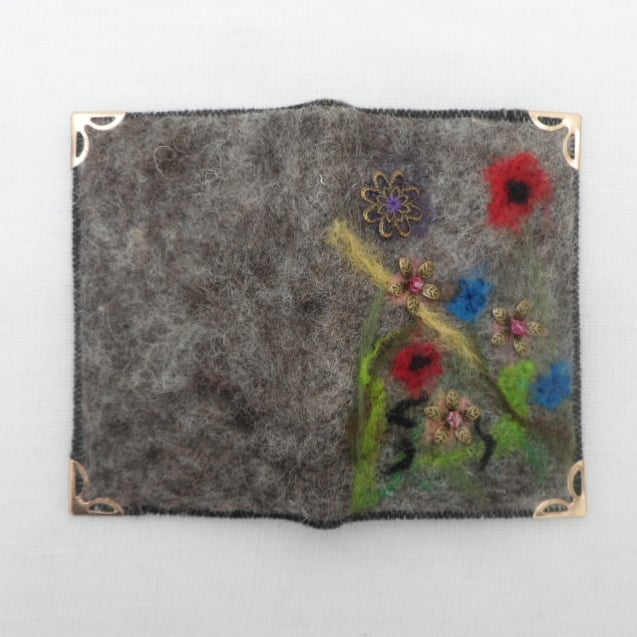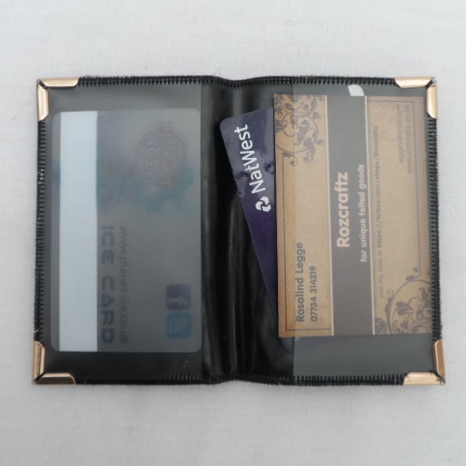 A simple card holder for your ID, business cards or credit cards. Hardwearing black plastic on the inside with clear pockets meaning you can show your card without removal. The outer cover of handmade felt which has been stitched securely into place. The felt has been made using a nuno felting technique whereby a grey jacob wool has been felted to a cotton muslin base to give it strength and stability. Needle felted floral decoration with antique brass and beaded embellishment have been added to the front cover. Complete with gold coloured metal corner protectors to increase durability. It measures approximately 3" x 4" and has two clear pockets available for cards. Each pocket can take several cards.