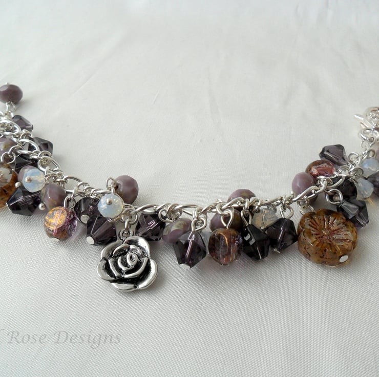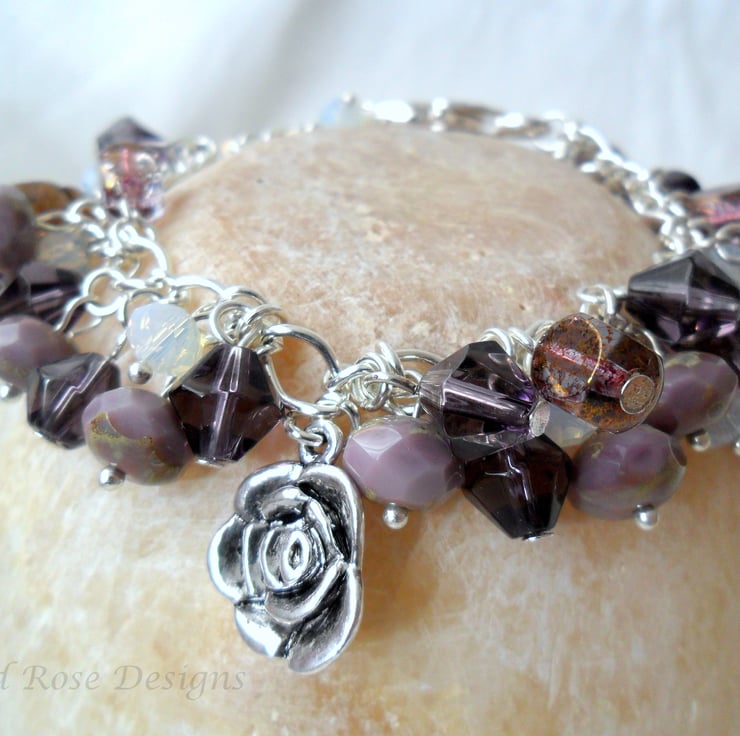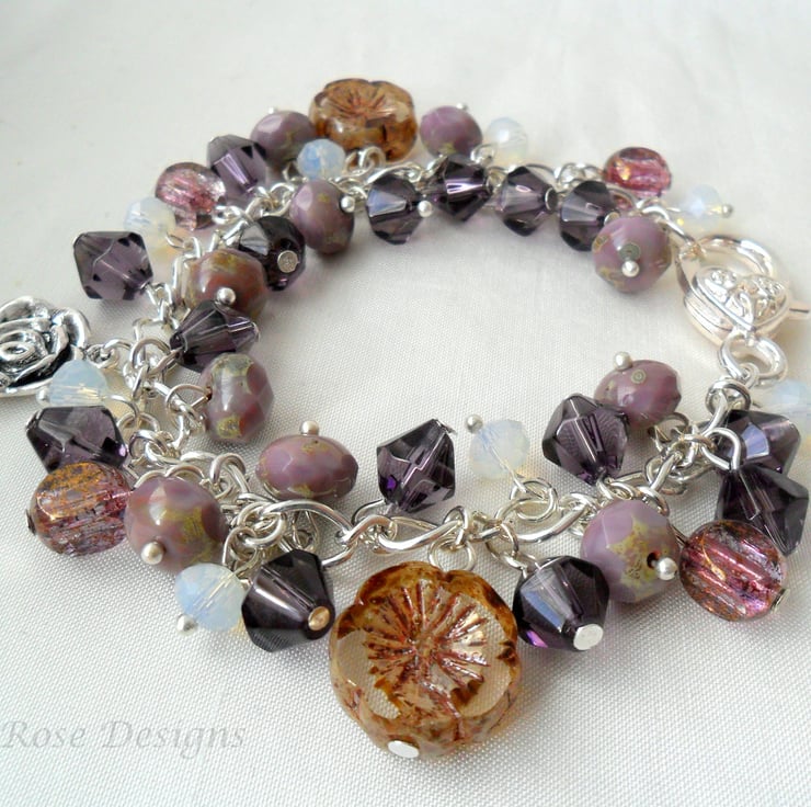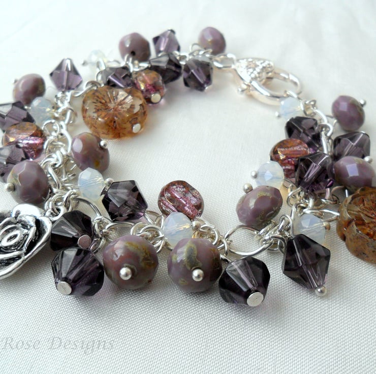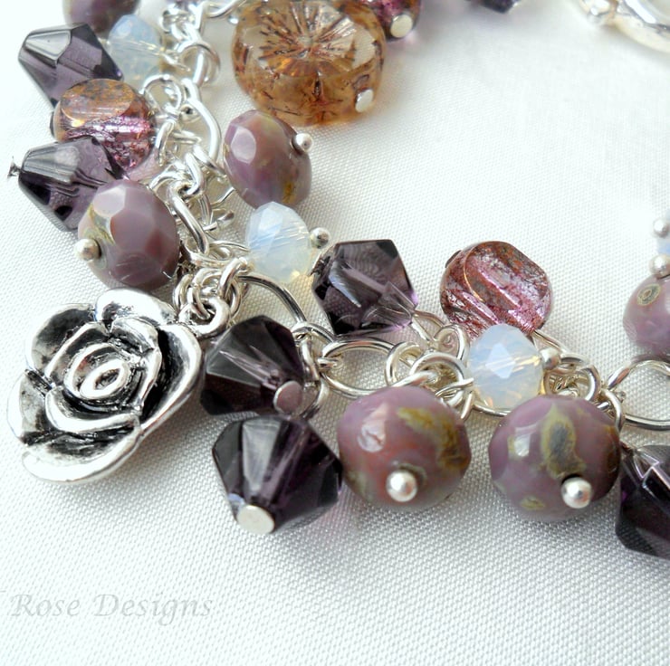 This pretty charm style bracelet has a mix of purple, mauve and opal beads - 39 in total and a silver rose charm at the centre. The beads include opal crystal rondelles, purple bi-cones, opaque purple donuts with a half picasso finish, golden purple preciosa Czech glass rounded cubes and flower patterned disc beads. This handmade bracelet measures 7 1/2" (19 cm) long including the silver-plated heart trigger clasp.
