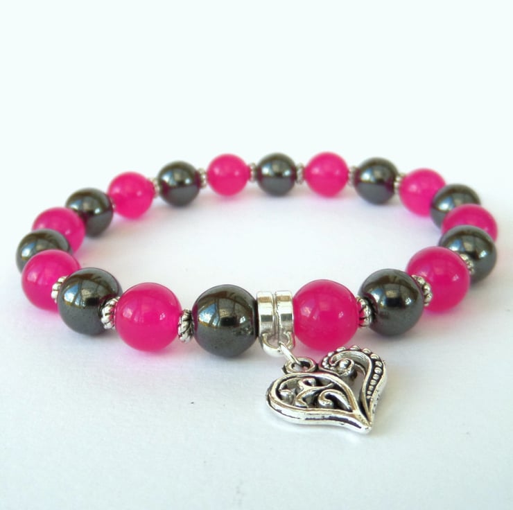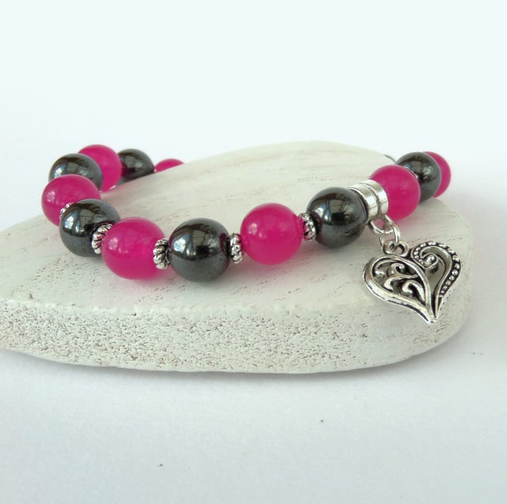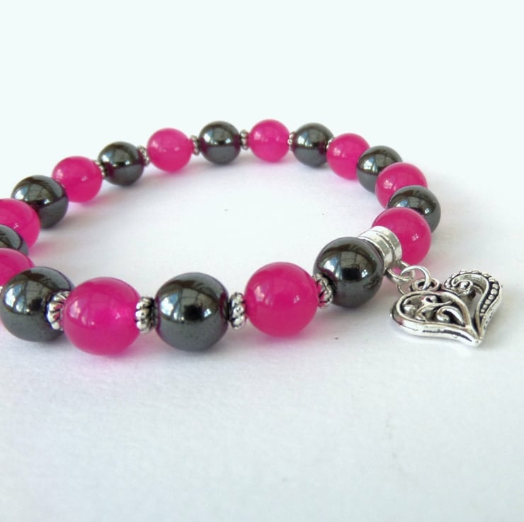 Deep rose pink jade and hematite look perfect together in this unique bracelet.