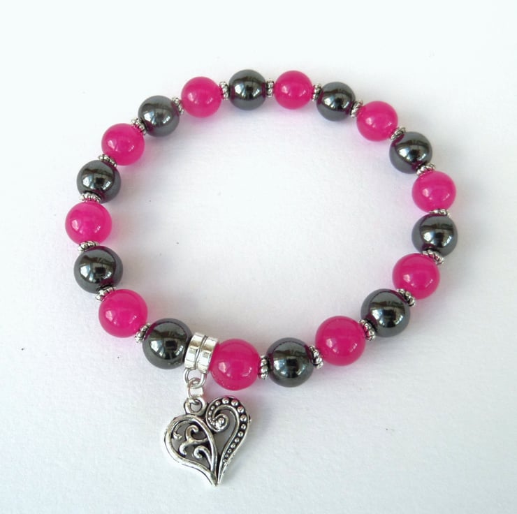A stunning handmade and unique stretchy bracelet, with lovely rose pink jade and gorgeous polished hematite.