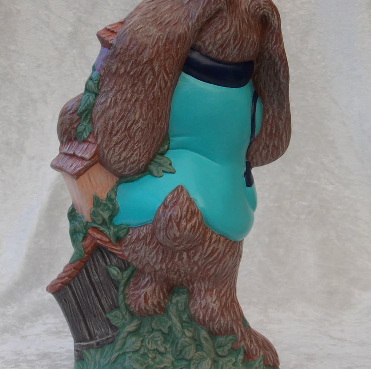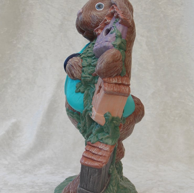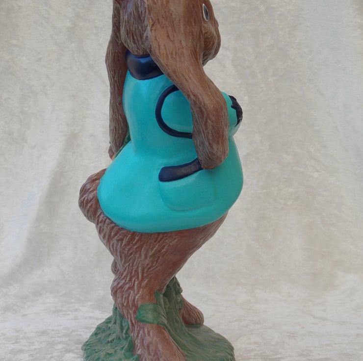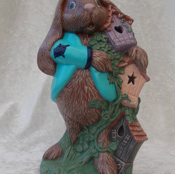 I have for sale a ceramic animal ornament, which was hand painted by myself. It is a standing figurine of a brown rabbit, which is wearing a turquoise and navy blue jacket. In its arms are a large green climbing plant and a pile of three assorted bird boxes. One is a dark brown, one a peach colour and the other one is a lilac colour, all have a terracotta coloured tiled roof. This would make a lovely addition to anyone's home, or perhaps given as a gift.