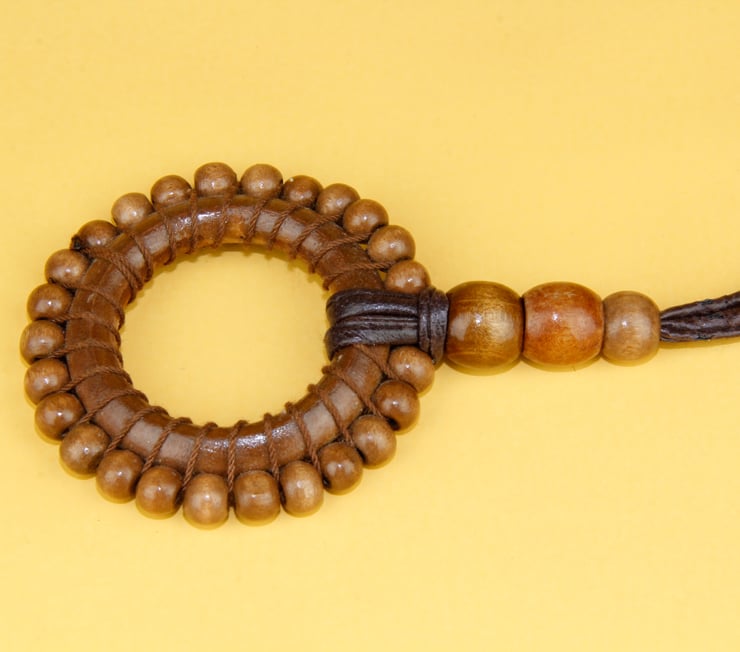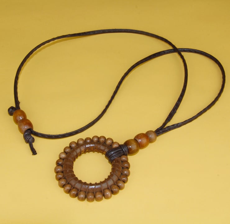 A central wooden circle 40mm wide wrapped with 20 small circular wooden beads suspended from a brown leather thong with 3 supporting wooden beads.