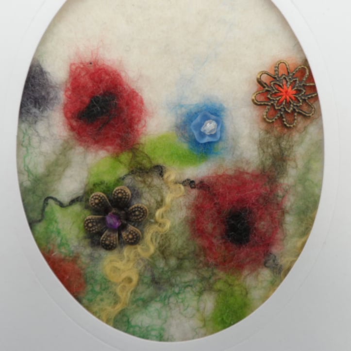 A gorgeous card made using a piece of felt made from white merino wool onto which merino wool and silk fibres have been laid out and wet felted to give a floral design. This floral pattern has then been embellished using antique bronze effect findings and bead detail. The felt piece has been mounted on an A6 size white greetings card with an oval window frame. The card has been left blank inside for your own message and is provided complete with a white envelope in a cellophane presentation bag.