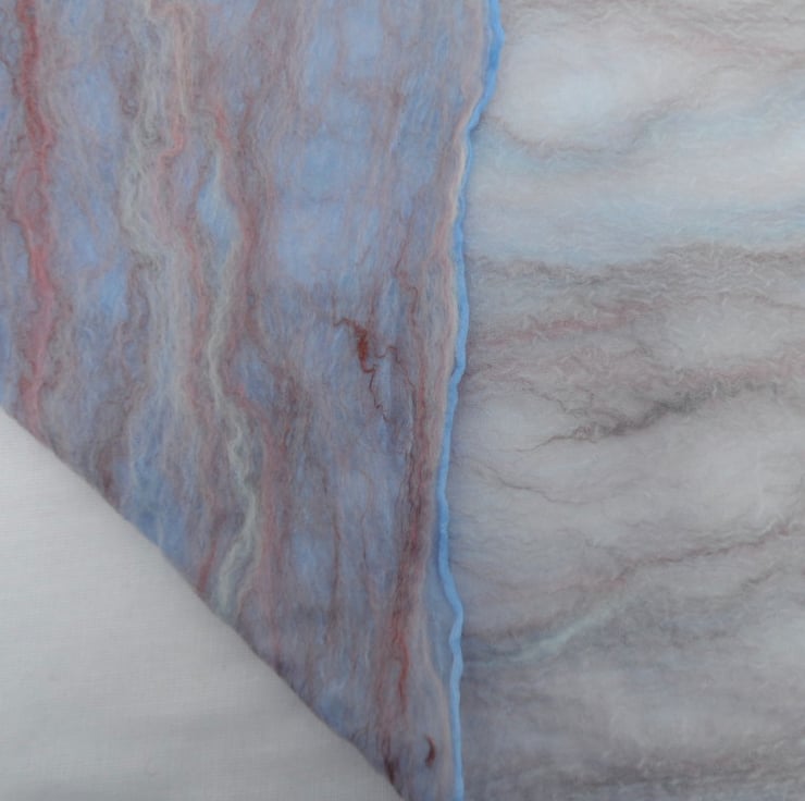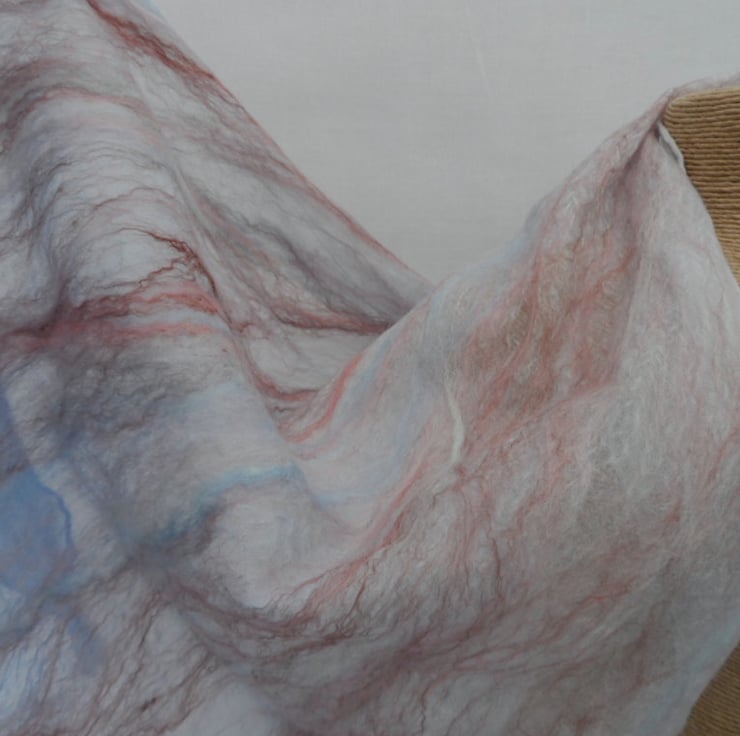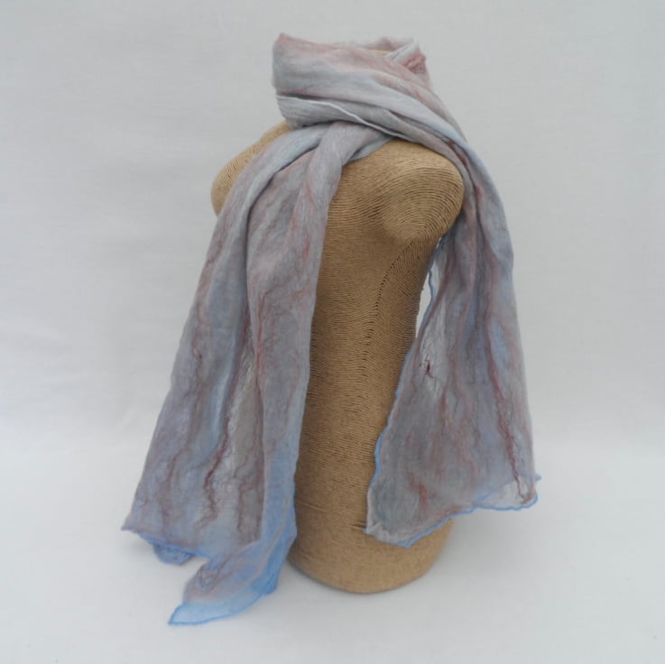 Two felting techniques have been combined to create this scarf. Very fine, sheer layers of a blend of blue and salmon pink merino wool blended with brown bamboo fibres have be laid down to create a cobweb felt layer on one side of a blue silk chiffon scarf and this has then been nuno felted to allow the wool fibres to migrate through the silk and bind with it. This produces a scarf with the sheer, transparent nature of cobweb felt with the added strength of the silk chiffon layer. Shrinkage of the wool fibres during the felting process results in an attractive crinkled effect to the silk which is visible on the non felted side. The base scarf has a colour gradient along its length from dark to light blue and back again.