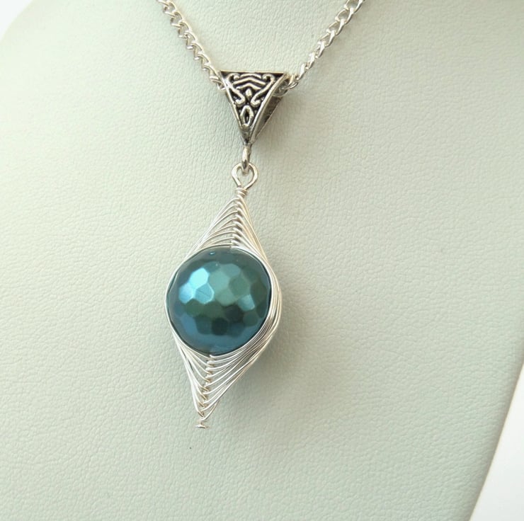 A stunning teal green faceted shell pearl wire wrapped in a lovely herringbone pattern is the focal point of this unique necklace.