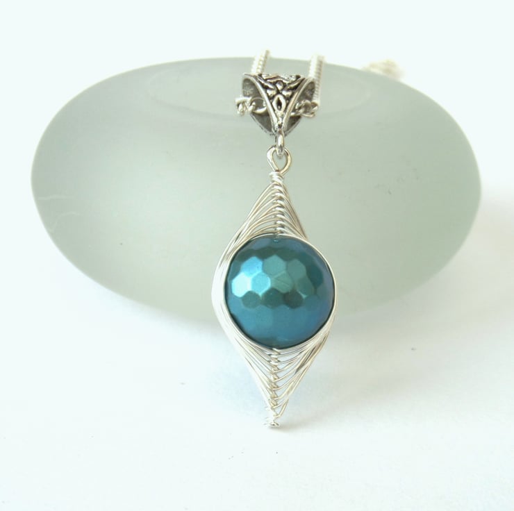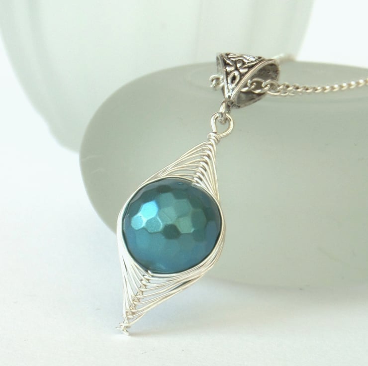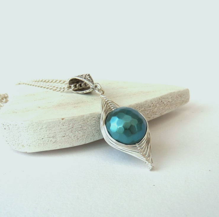 A stunning teal green faceted shell pearl wire wrapped in a lovely herringbone pattern is the focal point of this unique necklace.