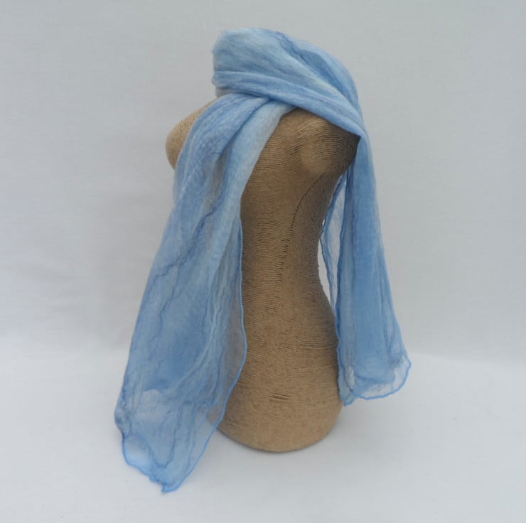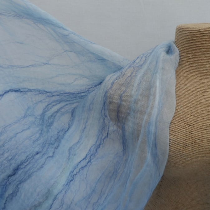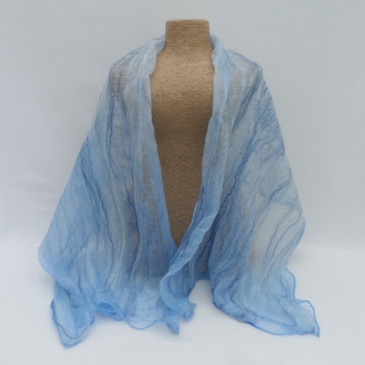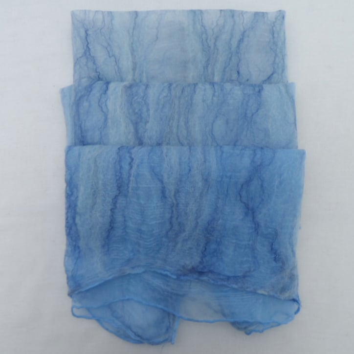 Two felting techniques have been combined to create this scarf. Very fine, sheer layers of a blend of blue and white merino wool blended with blue bamboo fibres have be laid down to create a cobweb felt layer on one side of a blue silk chiffon scarf and this has then been nuno felted to allow the wool fibres to migrate through the silk and bind with it. This produces a scarf with the sheer, transparent nature of cobweb felt with the added strength of the silk chiffon layer. Shrinkage of the wool fibres during the felting process results in an attractive crinkled effect to the silk which is visible on the non felted side. The base scarf has a colour gradient along its length from dark to light blue and back again.